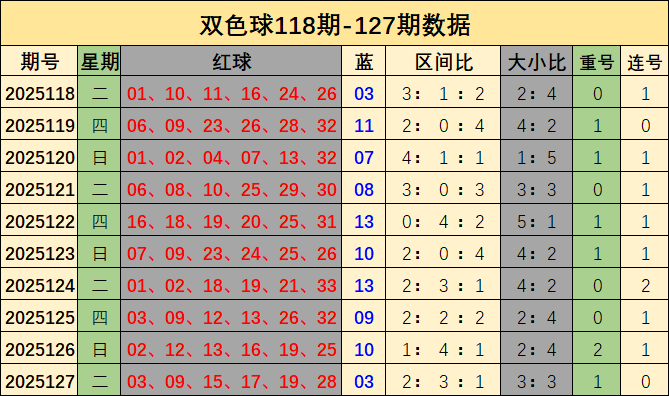 上期归来,开出奖号:红球03、09、15、17、19、28,蓝球03。红球号码大小比为3:3,三区比为2:3:1,奇偶比为5:1。本期红球开出重号19,未开出连号.