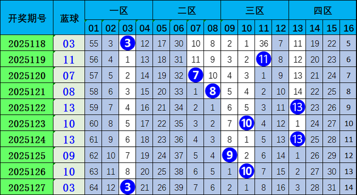 上期蓝球开出号码:03,近5期蓝球号码大小比为4:1;