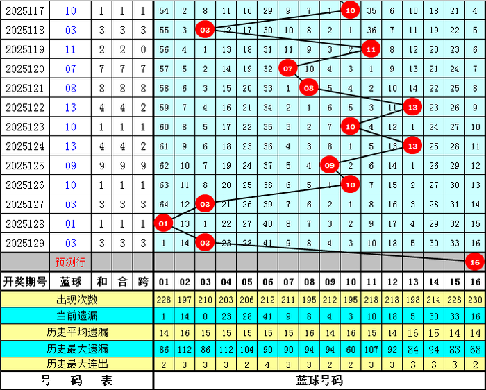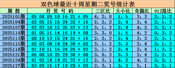 蓝球走势分析:上周二第25127期蓝球开出号码03,最近十周星期二蓝球号码大小比为4:6,奇偶比为5:5,012路比为2:4:4。本期蓝球重心关怀偶数号,看好蓝球14、16。