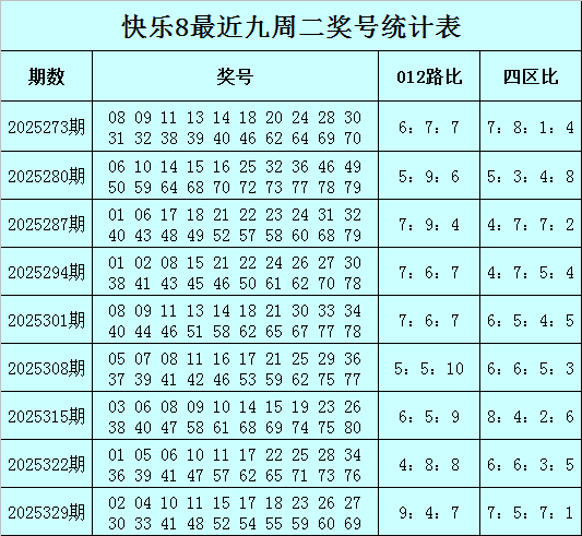 福彩风物8第2025329期(上周二)开奖回顾:02 04 10 11 15 17 18 23 26 27 30 33 41 48 52 54 55 59 60 69,其中奖号四区比为7:5:7:1,012路比为9:4:7。